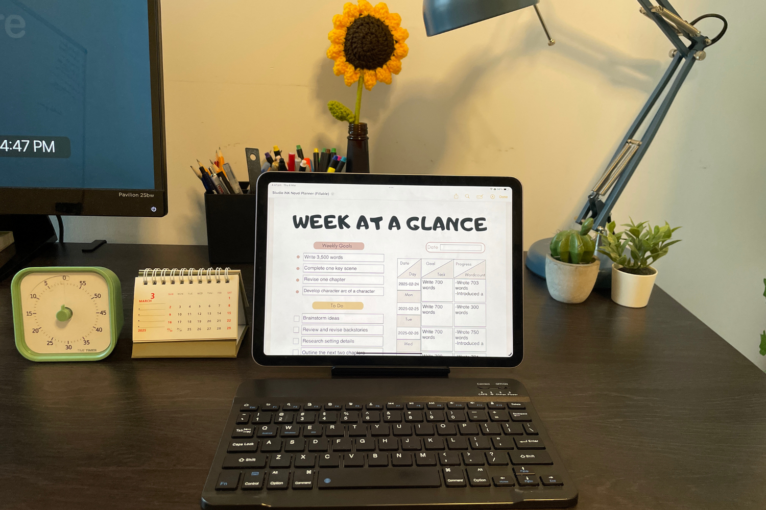 - Type directly into the novel planner, use apps such as GoodNotes or Notability, or print it out and write by hand.